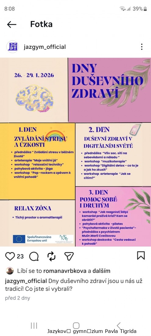 Také letos byl poslední lednový týden na naší škole věnován Dnům duševního zdraví, ve kterých byl pro zájemce z řad studentů a učitelů připraven bohatý program.