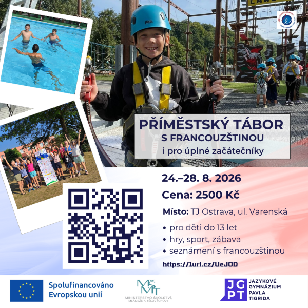 Už počtvrté pro vaše děti připravujeme oblíbený Příměstský tábor s francouzštinou, který proběhne v areálu Tělovýchovné jednoty Ostrava na ulici Varenská 3098/40a v Moravské Ostravě ve dnech 24.–28. 8. 2026, vždy od 8:00 do 16:00 hodin. Děti je možné přivážet již od 7:30. Tábor je určen pro děti do 13 let (nejmladší účastníci by měli umět číst a psát).