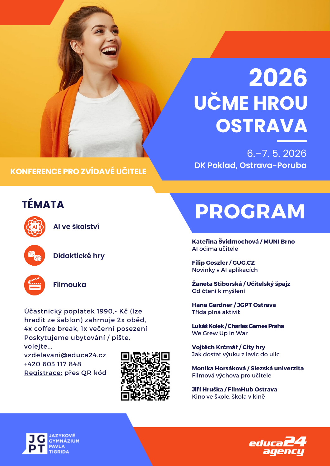 Akce reaguje na rostoucí poptávku učitelů po moderních didaktických metodách, které by propojily vzdělávání s herními aktivitami. Z velké části to jsou dnes především počítačové vzdělávací hry, umělá inteligence a virtuální realita, ale také různá kreativní cvičení. Všechny workshopy dvoudenní konference jsou koncipovány jako praktická cvičení, ze kterých by si učitelé měli odnést především inspirace a náměty jak do výuky herní a aktivizační prostředky zapojit. Lektoři patří mezi ty nejlepší v ČR, kteří se metodikou her a problematikou propojení digitálních dovedností se vzděláváním zabývají. Věnujte prosím pozornost doprovodným medailonkům a neváhejte s registrací. Akce má omezenou kapacitu. Konference se koná v DK Poklad v Ostravě. PROGRAM najdete níže na stránce, účast objednejte přes web Educa24 agency.